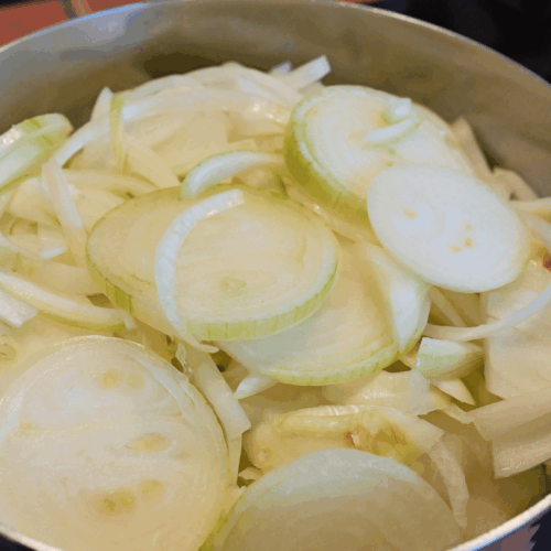 Wielu kucharzy spieszy się z tym etapem, ale to właśnie półtorej godziny spokojnego smażenia cebuli decyduje o magii tego dania. Cebula przechodzi transformację – z ostrych, surowych krążków staje się słodka, miękka i bursztynowa. To nie jest przypalanie! To delikatne wydłużanie naturalnych cukrów, które tworzą warstwowy, karmelowy smak bez grama dodatkowo dosypanego cukru. Oliwa z masłem zapobiega przypalaniu, a sól na początku pomaga uwolnić wilgoć.
