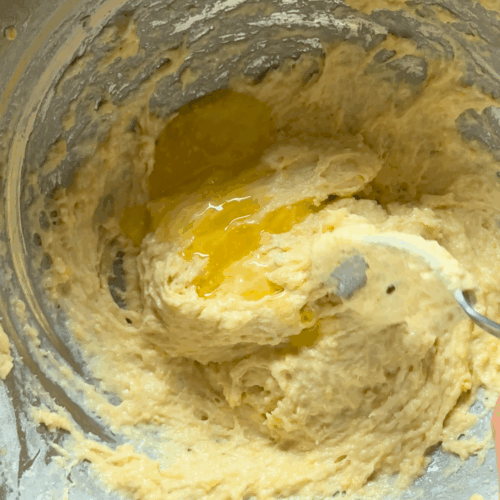 - Zacząć wyrabiać ciasto mikserem z hakiem. (Ciasto jest bardzo klejące). Podczas wyrabiania wlewać stopniowo roztopione, chłodne masło.