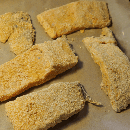Klasyczna trójstopniowa panierka to fundament udanego przepisu. Mąka tworzy bazę przyczepności, roztrzepane jajko działa jak klej, a bułka tarta daje tę upragnioną chrupkość. Oliwa z oliwek podczas pieczenia nadaje całości złocisty kolor i delikatną nutę smakową. Warto pamiętać, że temperatura 170 stopni to optimum. Zbyt wysoka temperatura spali panierkę zanim ryba zdąży się dopiec.