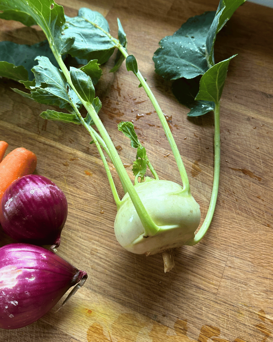 - Warzywa cienko kroimy obieraczką, lub nożem w cienkie plasterki, cebulę w piórka. Można użyć tarki typu mandolina.2 marchewki, 1 kalarepa, 1 czerwona cebula