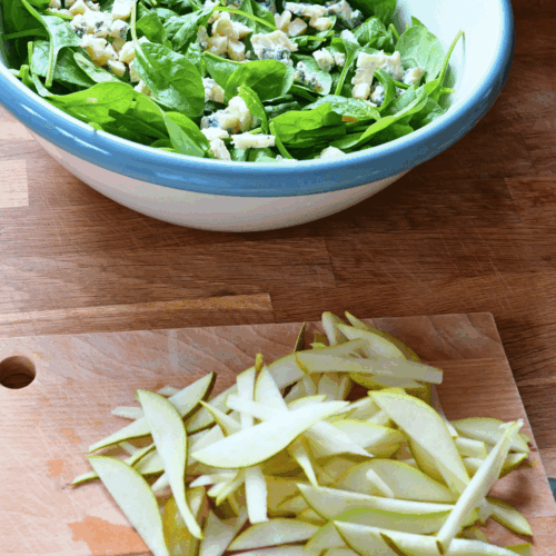 Sałatka z gruszką, szpinakiem, gorgonzolą i orzechami