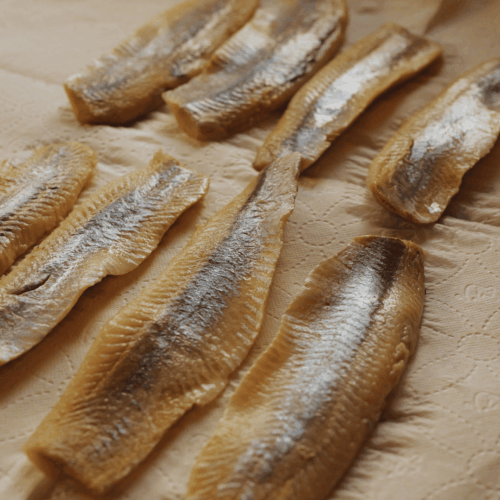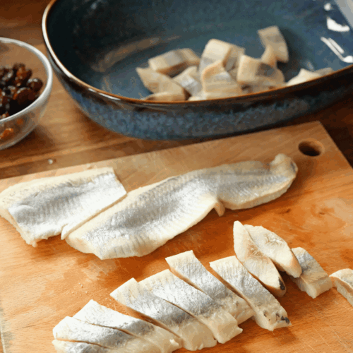 - Śledzie moczymy przez 2-3 godziny, wymieniając wodę co godzinę. Można mały kawałek odkroić i sprawdzić czy pasuje Wam smak.500 g filetów śledziowych z solanki