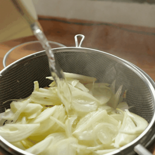 - Cebulę kroimy w piórka, a następnie przelewamy wrzątkiem.2 szt średnie cebule