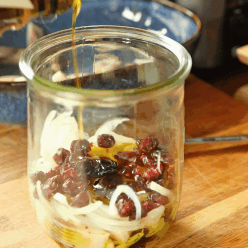 - Układamy warstwowo w słoiku na zmianę: śledzie, pieprz, cebula, żurawina, trochę oleju, śledzie..itd Każdą warstwę dociskamy lekko łyżką.150 g suszonej żurawiny, 200 ml olej rzepakowy, pieprz mielony