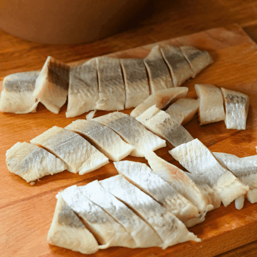 - Osuszamy śledzie na ręczniku i kroimy w małe kawałki.