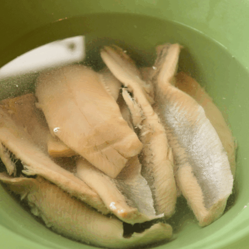 - Śledzie moczymy przez 2-3 godziny, wymieniając wodę co godzinę. Można mały kawałek odkroić i sprawdzić czy pasuje Wam smak.500 g filetów śledziowych z solanki