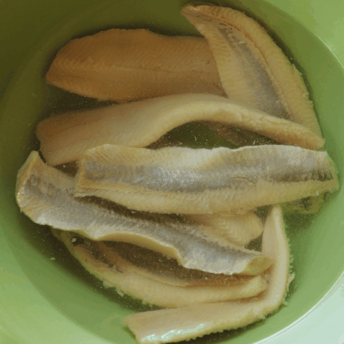 - Śledzie moczymy przez 2-3 godziny, wymieniając wodę co godzinę. Można mały kawałek odkroić i sprawdzić czy pasuje Wam smak.500 g filetów śledziowych z solanki