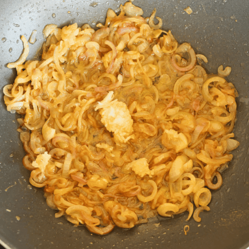 - Jak już jest miękka, jest pyszna, zredukowała się i chcesz ją wyjadać łyżkami z patelni to znak aby dodać czosnek, przemieszaj i smaż 2 minuty.3 ząbki czosnku