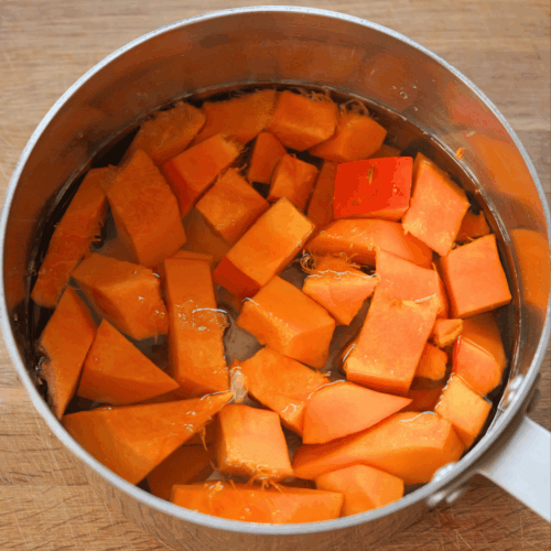 - W międzyczasie pewnie masz ugotowaną dynię, wynieś ją na taras lub balkon aby szybciej ostygła, możesz odlać wody, jeżeli masz za dużo. Wodę z gotowania odlej do osobnej miseczki bo może się przydać jeżeli będzie za gęste puree. Wody w garnku musi być tak na około 1 cm od dna.
