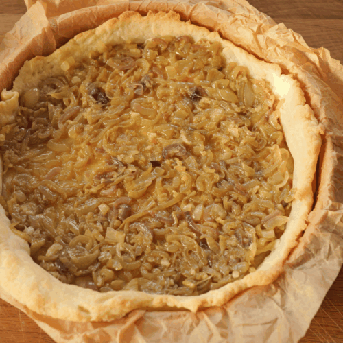 - Poczekaj aż ciasto trochę ostygnie i rozłóż mieszankę cebulowo-czosnkową równomiernie na dnie upieczonego ciasta.
