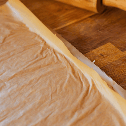- Każdą część rozwałkowujemy pomiędzy dwa arkusze papieru do pieczenia