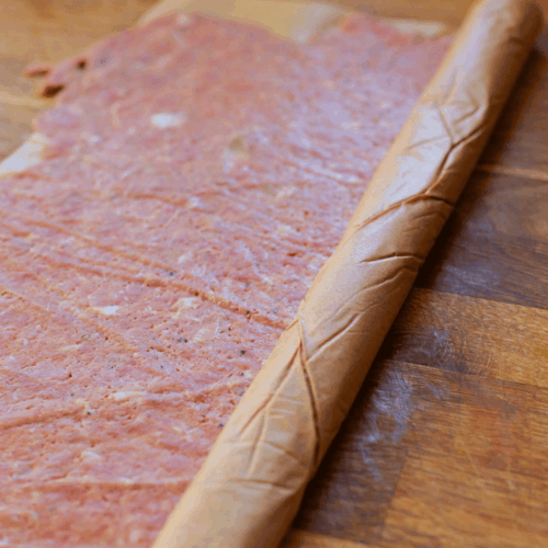 - Ciasno zwijamy arkusz z mięsem w rulon.